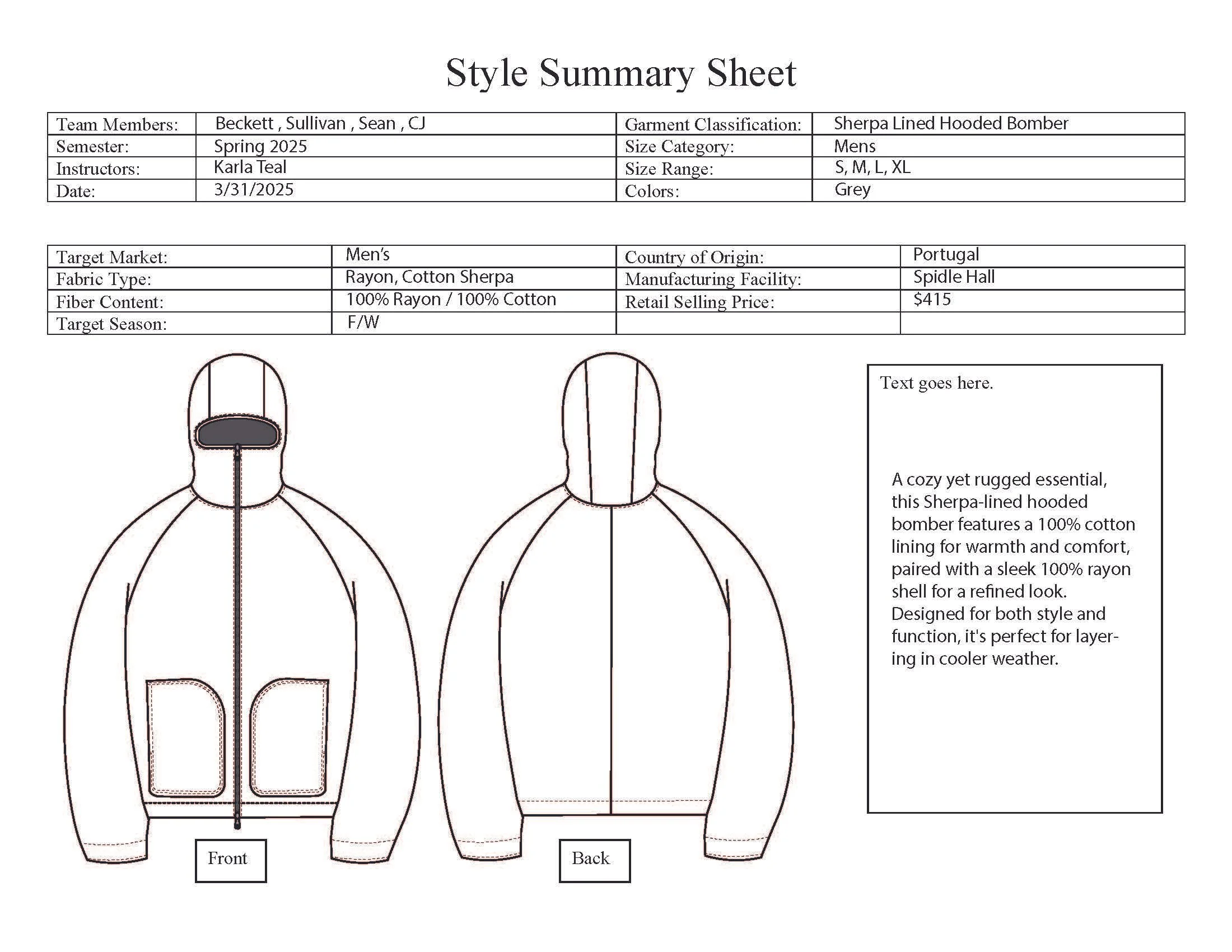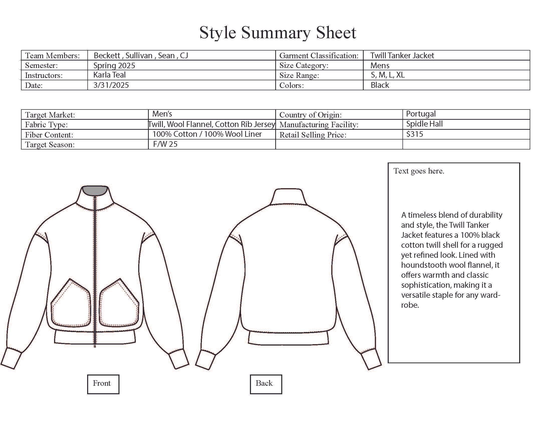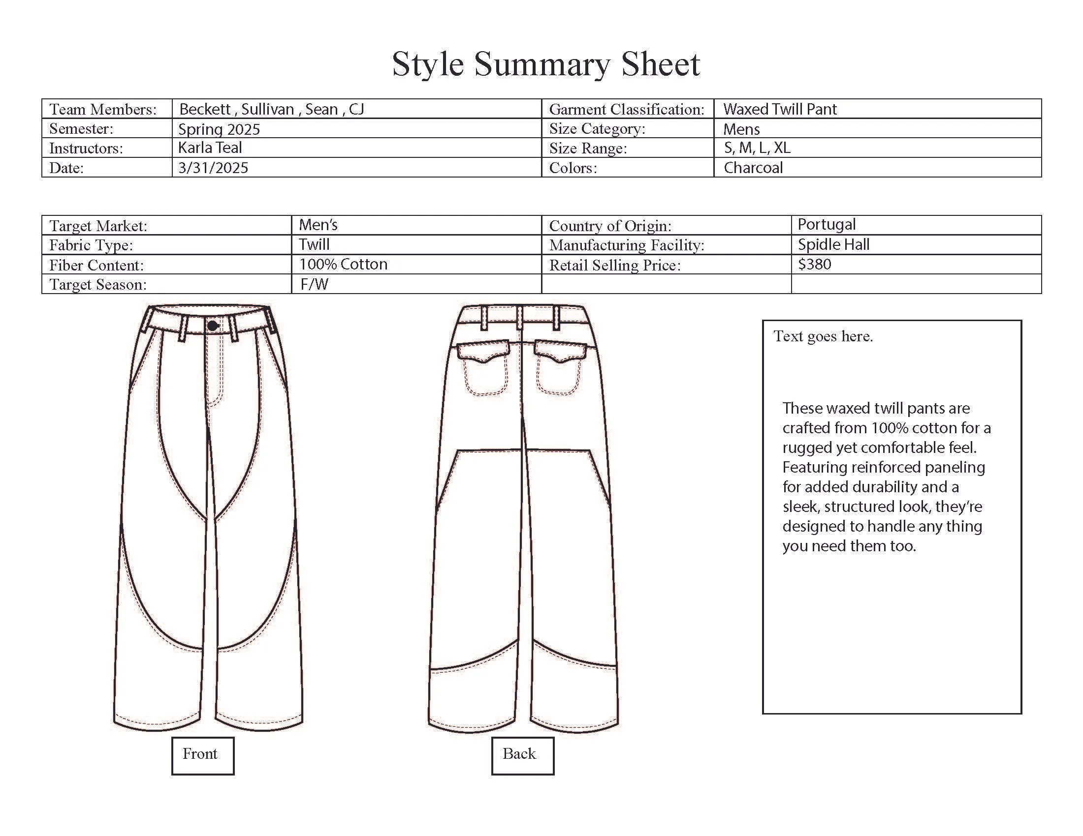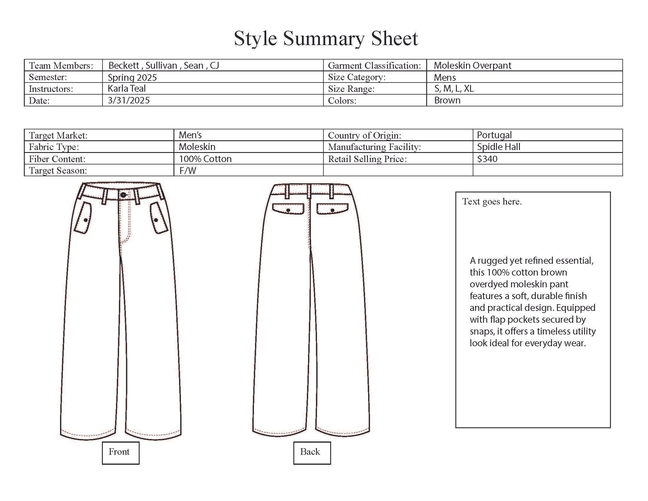 Upon completion of the project, we assembled a comprehensive spec pack for each garment in the collection. This included a style summary, detailed patterns, costing, fabric specifications, operation bulletins, packaging details, size and care label designs, points of measure, and stitches and seams diagrams. A PDF of the full spec pack is linked below.