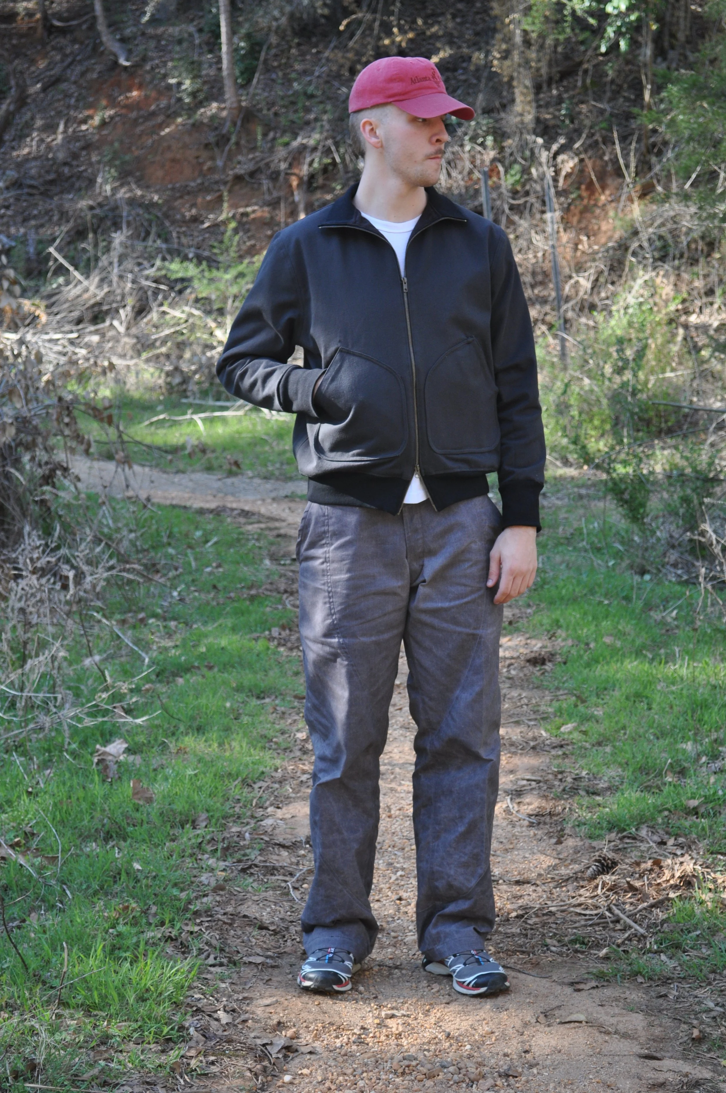 For my first look, I designed a track jacket paired with water-repellent waxed twill hiking pants. The jacket draws inspiration from U.S. Army tanker jackets worn during World War II and features all-cotton ribbed cuffs, a midweight cotton twill shell, and a warm wool lining. A two-way zipper allows for adjustable wear and versatility in changing conditions.