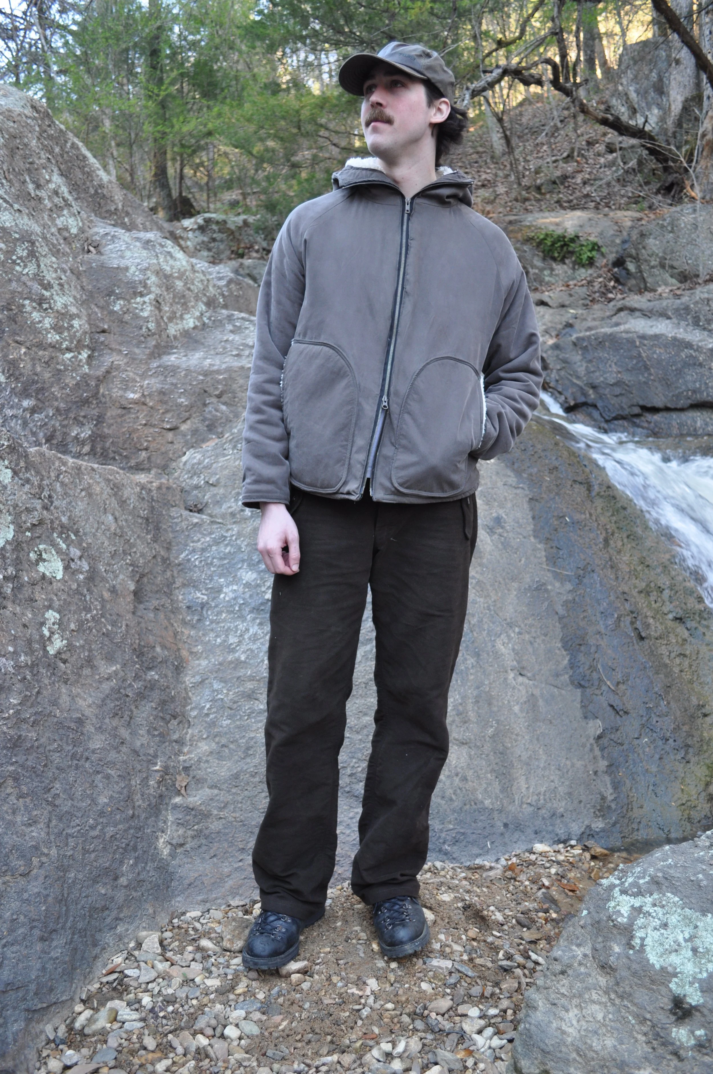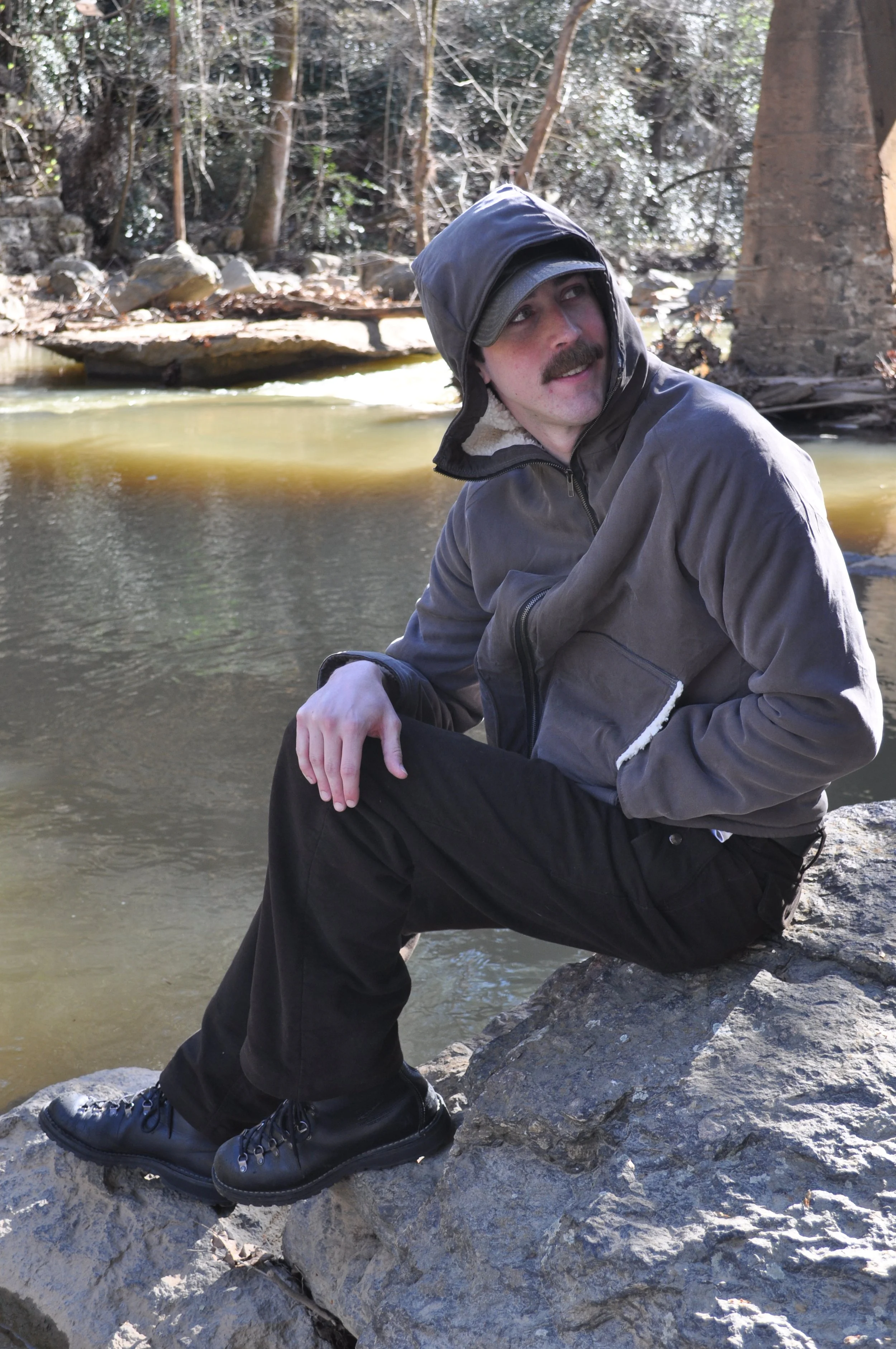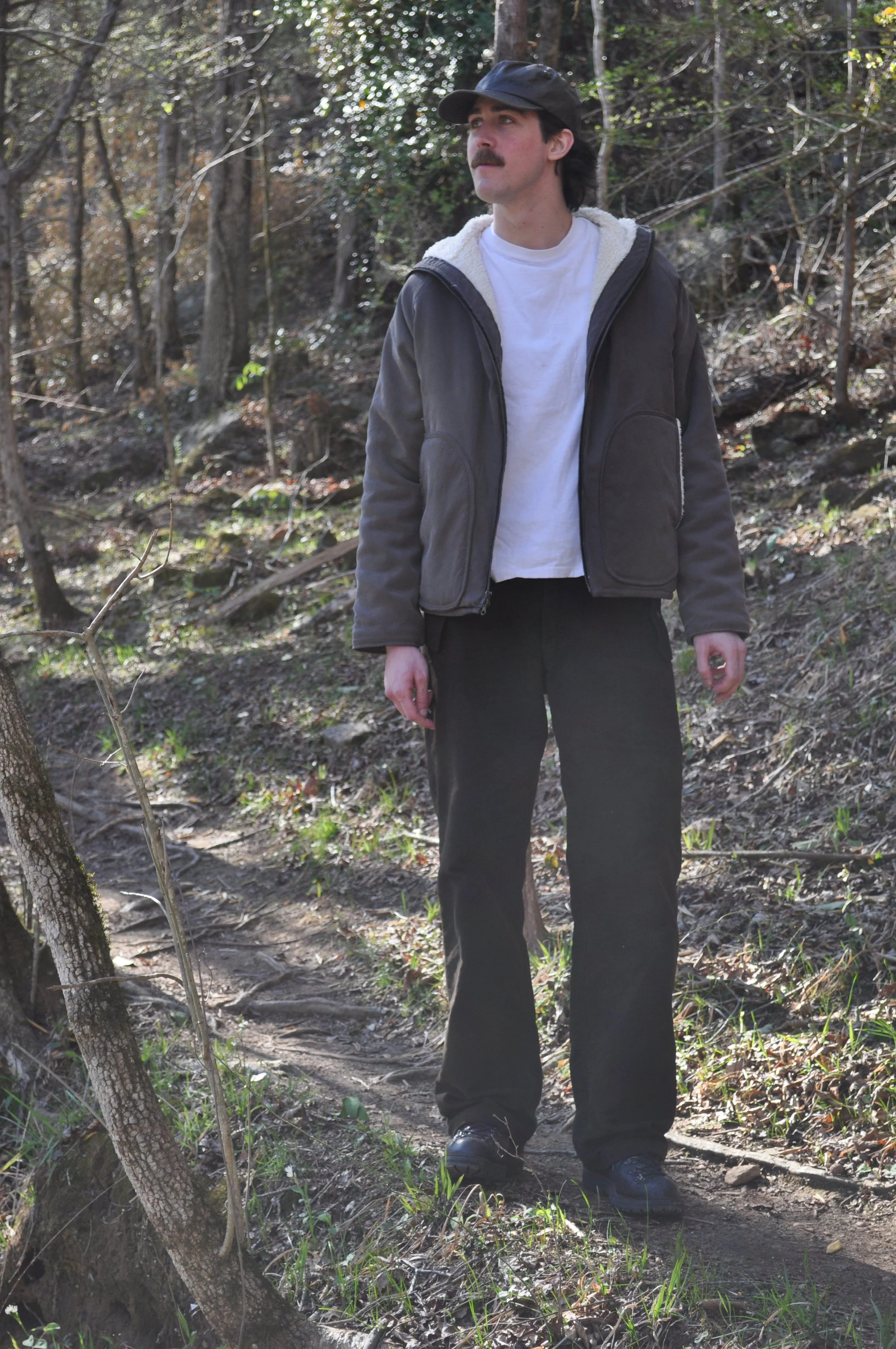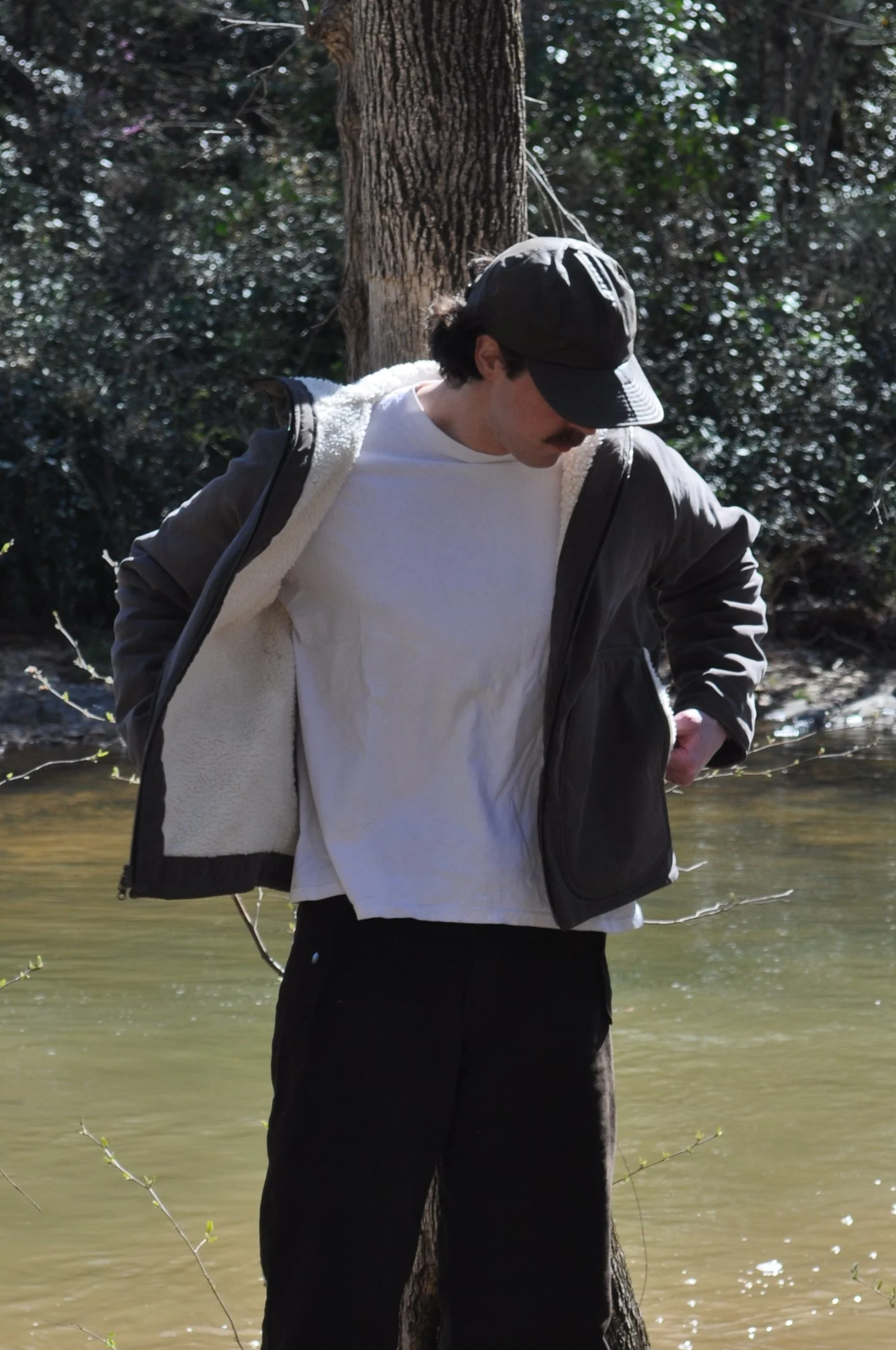 For my second look, I designed a pair of overdyed cotton moleskin pants paired with a warm, fleece-lined jacket. The pants emphasize durability and comfort, drawing from traditional workwear silhouettes adapted for outdoor use. The jacket is constructed from a tightly woven rayon shell and fully lined with a 600 GSM all-cotton sherpa fleece, providing substantial insulation while staying true to the collection’s focus on natural fibers and functional performance